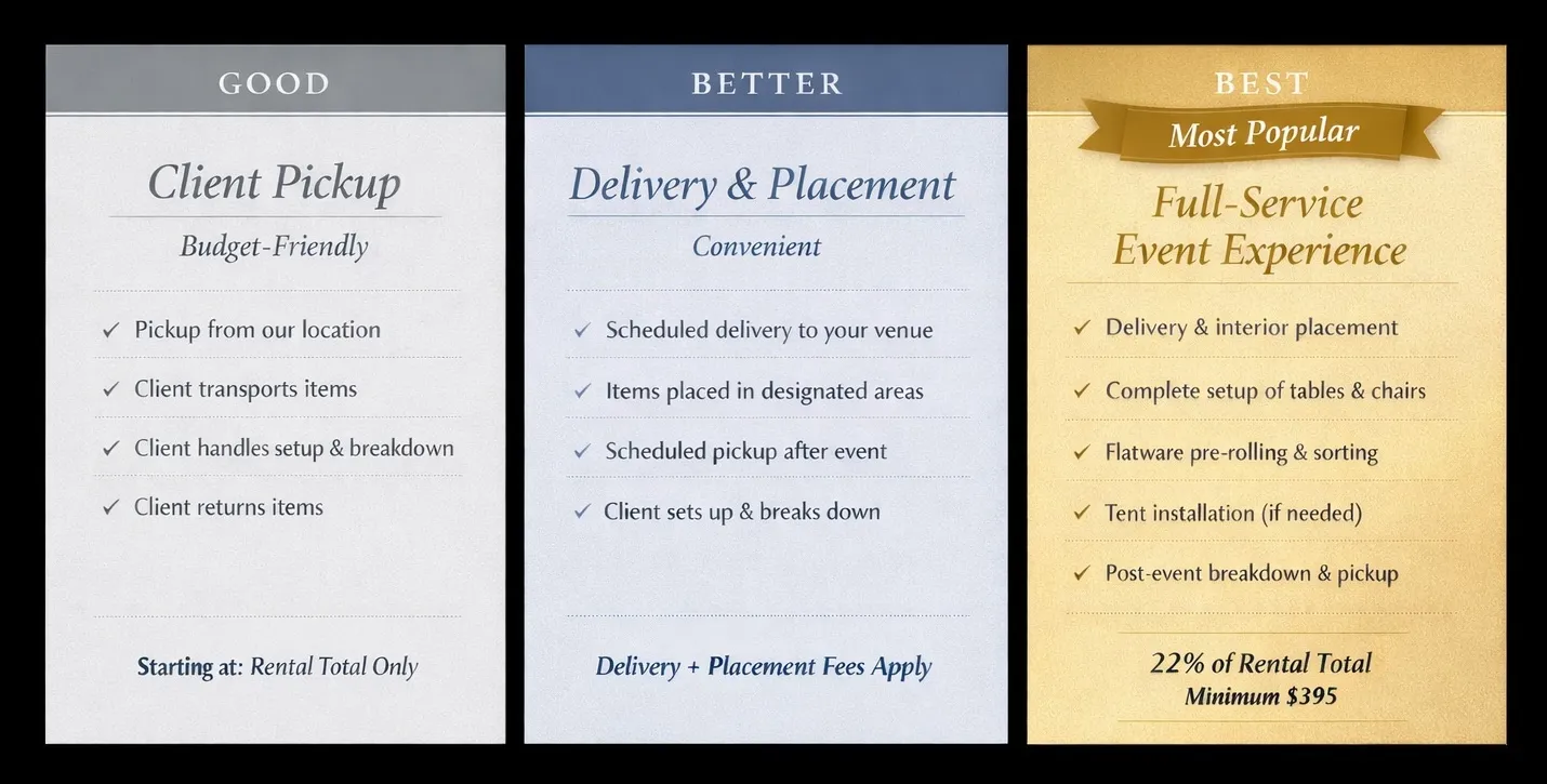 Our Event Services & Logistics options include delivery, placement, setup support, vertical transport coordination, flatware pre-rolling and sorting, and other labor-based services designed to simplify your planning process.